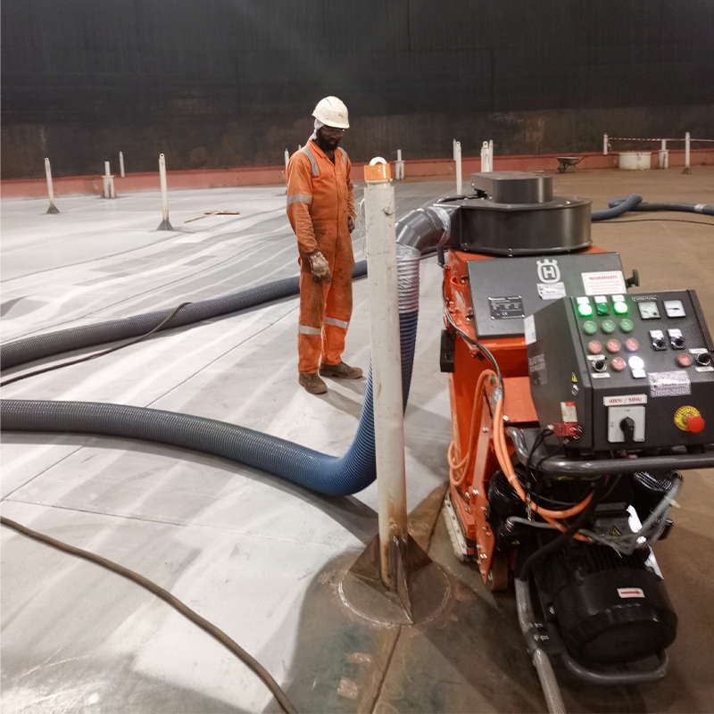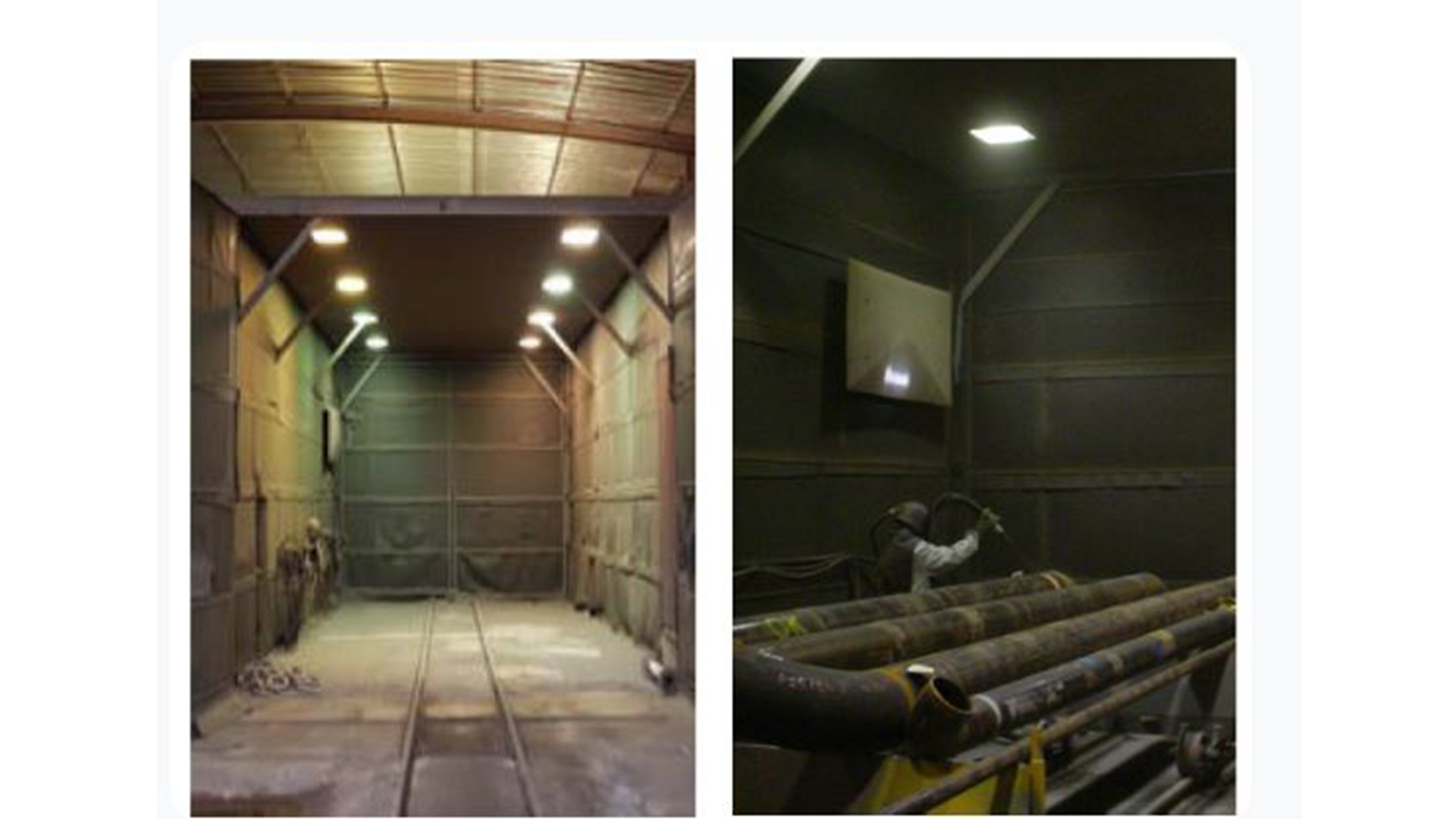 Nous disposons d'une cabine de grenaillage de 14m de long, 5m de large et 5m de haut, nous permettant de travailler dans une enceinte close, respectant ainsi l'environnement tout en recyclant l'abrasif utilisé et nous permettant de traiter environ 250m2/jour/poste.