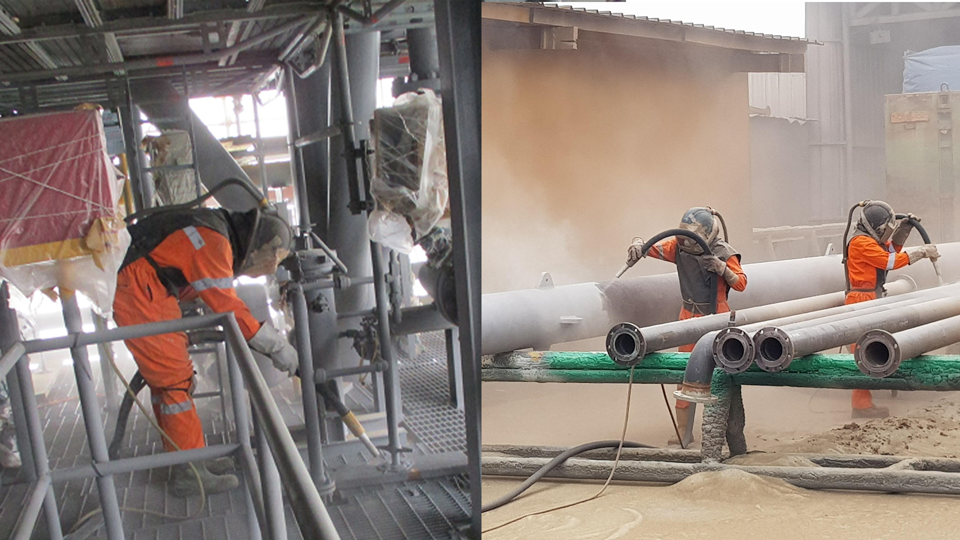 Nous disposons d'une cabine de grenaillage de 14m de long, 5m de large et 5m de haut, nous permettant de travailler dans une enceinte close, respectant ainsi l'environnement tout en recyclant l'abrasif utilisé et nous permettant de traiter environ 250m2/jour/poste.